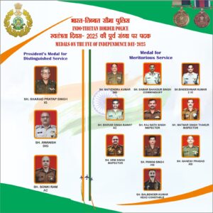 भारततिब्‍बत सीमा पुलिस बल (ITBP) के 13 पदाधिकारियों को 79वें स्‍वतंत्रता दिवस के अवसर पर पुलिस पदकों से विभूषित किए जाने की घोषणा की गई है। इनमें से 03 को विशिष्‍ट सेवा के लिए राष्‍ट्रपति पदक एवं 10 पदाधिकारियों को मेरिटोरियस सेवा के लिए पदकों से नवाजा गया है। पदक विजेताओं का विवरण निम्‍नानुसार है:-