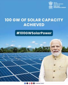 केंद्रीय मंत्री प्रल्हाद जोशी के मार्गदर्शन में नवीन और नवीकरणीय ऊर्जा मंत्रालय (एमएनआरई) भारत में नवीकरणीय ऊर्जा क्षमता को बढ़ाने के लिए प्रमुख पहलों को लागू कर रहा है। सौर ऊर्जा में 100 गीगावाट की यह उपलब्धि एक अक्षय ऊर्जा महाशक्ति के रूप में भारत की भूमिका को रेखांकित करती है, जो लाखों लोगों के लिए स्वच्छ, सतत और सस्ती ऊर्जा तक पहुंच सुनिश्चित करते हुए एक आत्मनिर्भर ऊर्जा भविष्य को आकार प्रदान करती है।