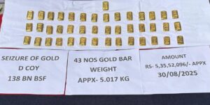 BSF ने भारत-बांग्लादेश सीमा के पास पश्चिम बंगाल में ₹5 करोड़ रूपये मूल्य का सोना जब्त किया । 30 अगस्त 2025 को सीमा पार अपराधों पर लगाम कसने के अपने निरंतर प्रयासों के तहत एक बड़ी सफलता प्राप्त करते हुए, सीमा सुरक्षा बल (BSF) गुवाहाटी फ्रंटियर के अंतर्गत तैनात 138वीं वाहिनी के जवानों ने पश्चिम बंगाल के कूचबिहार जिले में एक विशेष अभियान के दौरान 43 सोने की बिस्किट जब्त किया है।