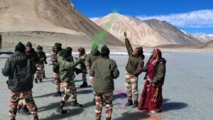 लद्दाख के दुर्गम और बर्फीले क्षेत्र में स्थित पैंगोंग झील (14,300 फीट) पर इस वर्ष होली का उत्सव देशभक्ति और सांस्कृतिक रंगों के साथ मनाया गया। शून्य से नीचे तापमान और जमी हुई झील के बीच भारत-तिब्बत सीमा पुलिस (आईटीबीपी) की नॉर्थ वेस्ट फ्रंटियर इकाई के जवानों ने स्थानीय ग्रामीणों के साथ मिलकर रंगों का त्योहार उत्साहपूर्वक मनाया।