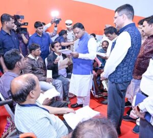 9 फरवरी, 2026 को मुख्यमंत्री मोहन चरण माझी, यूनिट 2, भुवनेश्वर में स्थित राज्य शिकायत निवारण कक्ष में आम लोगों की शिकायतें सुनते हुए।