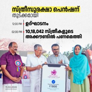 मुख्यमंत्री पिनाराई विजयन ने 11 फरवरी दोपहर 12 बजे राज्य स्तरीय ‘महिला सुरक्षा पेंशन स्कीम’ का उद्घाटन किया। उद्घाटन के 2 घंटे के अंदर, 10,18,042 लाभार्थियों के बैंक अकाउंट में 1,000 रुपये आ गए हैं। 35 से 60 साल की महिलाएं, जो आर्थिक रूप से पिछड़ी हैं और दूसरी सोशल वेलफेयर स्कीम की सदस्य नहीं हैं, और ट्रांस महिलाओं को अब हर महीने 1,000 रुपये मिलने लगेंगे।