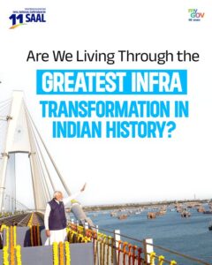 ‘एक्स’ पर MyGovIndia की अलग-अलग पोस्टों पर मोदी ने लिखा: #11YearsOfInfraRevolution के अंतर्गत बेहतरीन बुनियादी ढांचे को जोड़ा गया है जिसने भारत के विकास को गति दी है। रेलवे से लेकर राजमार्गों, बंदरगाहों से लेकर हवाई अड्डों तक, भारत का तेजी से फैल रहा इंफ्रा नेटवर्क ‘जीवन सुगमता’ को गति प्रदान कर रहा है और समृद्धि को बढ़ावा दे रहा है।