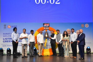 मुख्यमंत्री भूपेंद्र पटेल ने गुरुवार को मुंबई नेशनल स्टॉक एक्सचेंज में सूरत महानगर पालिका के म्युनिसिपल ग्रीन बॉण्ड की बेल रिंगिंग कर लिस्टिंग कराई। इस अवसर पर सूरत के महापौर दक्षेश मावाणी भी उपस्थित थे।