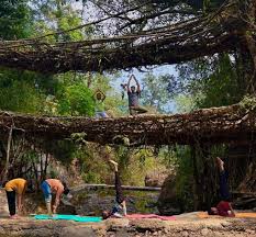 लिविंग रूट ब्रिज यूनेस्को की विश्व धरोहर में शामिल होने की प्रक्रिया में है। यह ब्रिज रबर और अंजीर के पेड़ों की जड़ों से पूरी तरह हवा में बुना गया है, जो चामत्कारिक तौर पर एक जीवंत मार्ग बनाता है और समय के साथ मजबूत होता जाता है। हरे-भरे वर्षावन और झरनों से घिरा पुल यह दिखाने को काफी है कि योग सिर्फ़ एक अभ्यास से कहीं ज़्यादा प्रकृति के साथ तालमेल बिठाने वाली ज़िंदगी जीने का तरीका है।